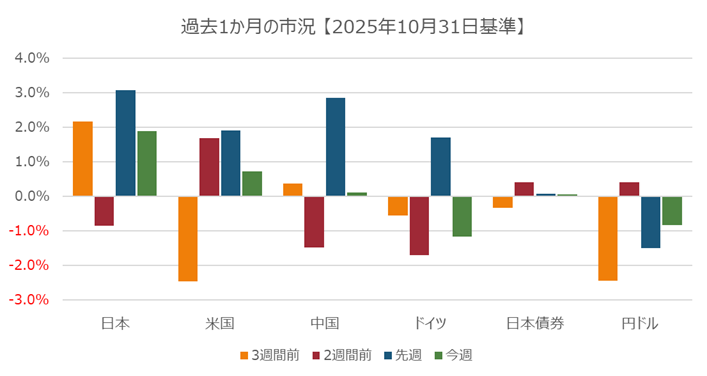 米国では、Fedが予想通り利下げを行ったが、パウエルFRB議長が12月の利下げを明言しなかったことから、市場では、SP500は横ばいとなった。トランプ大統領が習近平主席と会談がAI関連の半導体輸出を緩和させるのではないかとの期待からNvidiaは3.1%値を上げた。Verizon Communicationsは、iPhoneの影響もあり四半期利益が予想を超え、契約者数も増加したことから株価は2.3%上昇。また、第3四半期の業績が予想を超えたキャタピラーも11.6%株価上昇。欧州市場では英国のFTSEやスペインのIBEX 35は史上最高値を更新したが、欧州市場全体では米国のFedの政策会合決定前で市場は横ばい。スペインのSantanderの第3四半期の業績が予想を上回ったことから同株が4.3%上昇し、また、ドイッチェバンクも四半期利益が「増益となり5%株高に。銀行株全体でも1.4%の値上がり。2025年の販売・利益の予想を上方修正したGSKは6.6%株高に。銅、金、石油などの価格上昇を受けて鉱業・石油関連も値上がり