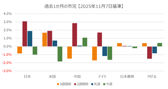米国市場では、AI関連の株式が値を上げた一方で、ヘルスケア関連が値下がり。そのため、NASDAQ、SP500は値上がりとなり、ダウは値下がり。AmazonはOpenAIを自社のクラウドで動かす契約を取り交わし、Amazon株は4.4%上昇。また、トランプ大統領が中国ほかの外国の最先端の半導体を締め出す発言をしたことからNvidiaは3.2%株価上昇。 Nexperiaを400億ドルで買収することを公表したKimberly-Clarkは14%株価下落。一方 Nexperia株は13.9%上昇。欧州市場では自動車関連がけん引して市場はわずかに上昇。ホワイトハウスが中国系の Nexperiaからの輸入を許可する方針が報じられ、ルノー、メルセデスベンツ、フォルクスワーゲンなどが2%前後の上昇になった。また、ライアンエアーはここ半年の利益が回復したことを公表し、株価は4%近く上昇。一方で、鉱業株は2%下落