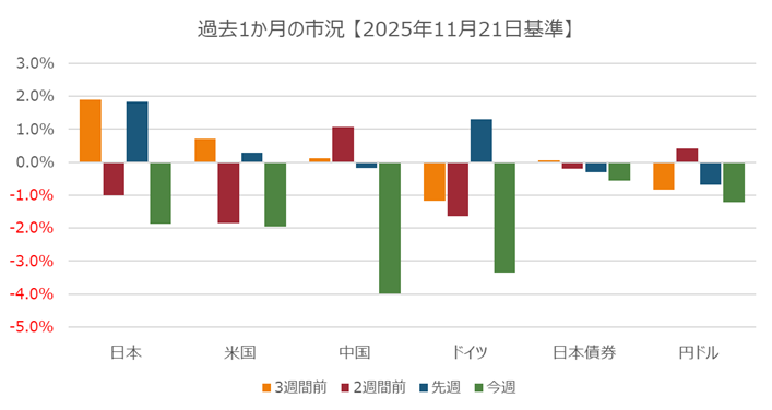 米国市場ではNASDAQは値上がり、SP500は横ばい、ダウは値下がりとなった。Nvidia、Palantir、マイクロソフトがいずれも1%以上株価上昇。12月の利下げ観測が減衰する中、来週に決算を公表するNvidiaが焦点になっている。ダウではウェイトの高いUnitedHealthが3.2%、Visaが1.8%値を下げたことがダウの下落の要因。Warner Bros Discoveryは戦略的な見直しの中で雇用契約を修正したことから株価は4%上昇。欧州市場では米国の利下げへの期待感が低下する中、銀行、テクノロジー関連の株式が低迷し、市場全体も値下がり。Siemens Energyはここ4年ほどで初めて配当を支払うことを公表し、また、中期的な見通しも引き上げたことから株価は9.4%上昇。英国では財務相が所得税の引き上げをしない方針を公表し、財政のバランスが疑問視され、国債のイールドが上昇し、株価は下落