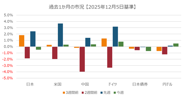 米国ではISMサービス指数は前月とほぼ変わらない水準であったが、支払金額は前月から顕著に下落した。また、ADPレポートでは11月の民間部門の雇用は予想外に下落。統計データが弱かったことから利下げへの期待感は維持され、株式指数はいずれも値を上げた。マイクとソフトはAI関連のソフトウェアの販売が低調で株価は3%下落。Marvell Technologyは半導体のスタートアップ企業であるCelestial AIを32.5億ドルで購入することを公表し、株価は7.3%上昇。欧州市場では金融株が下落したが、テクノロジー株が上昇し、市場全体としては横ばいの市場となった。Zaraのブランドを持つInditexはブラックフライデーの売り上げが好調で株価が8.9%値上がり。11月の欧州全体の景況感指数では製造関連が後退したが、サービス関連の伸びが相殺した形で、景況感指数は上昇した。テクノロジー関連のほか、ウクライナの和平交渉が十分なところに達していないとして防衛関連も上昇