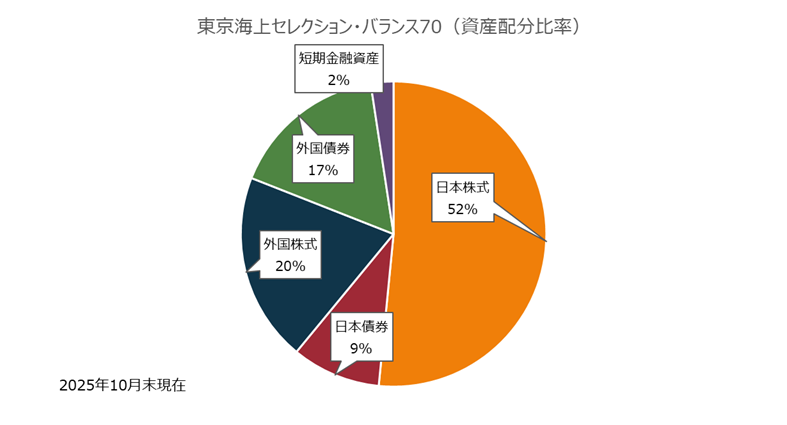 日本株式51.5%、日本債券9.4%、外国株式20.0%、外国債券16.6%、短期金融資産2.4%(2025年10月末)
