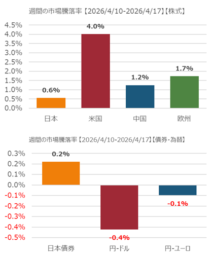 米国とイランの直接対話が来週パキスタンで再開されること、米国のルビオ国務長官がイスラエルとレバノンを招いて直接対話に入ったことなどを受けて、株式市場は史上最高値付近まで回復した。フィラデルフィア半導体指数は5日連続で史上最高値を更新した。ETFが好調であったBlackRockは第1四半期増益となり株価は3%上昇。同様に四半期決算が好調であったCitigroupはここ20年で最高の株価に上昇。一方、JPモルガンやウェルズ・ファーゴは決算が好調ではなく、株価も値を下げた。United AirlinesとAmerican Airlinesが合併するとの話が持ち上がり、両社とも株価上昇。欧州市場でも中東情勢の対話再開により株式市場は1%以上値を上げ、原油価格は1バレル当たり100ドルを下回ることになった。テクノロジー関連が好調で、BE Semiconductorが5.3%株価上昇したほか、ASML,ASMIなども株価上昇。原油価格が下がったため、ShellやBPはいずれも2%株価下落。LVMHは戦争により湾岸地域の売り上げが減少したことを公表したが株価はほとんど変動しなかった